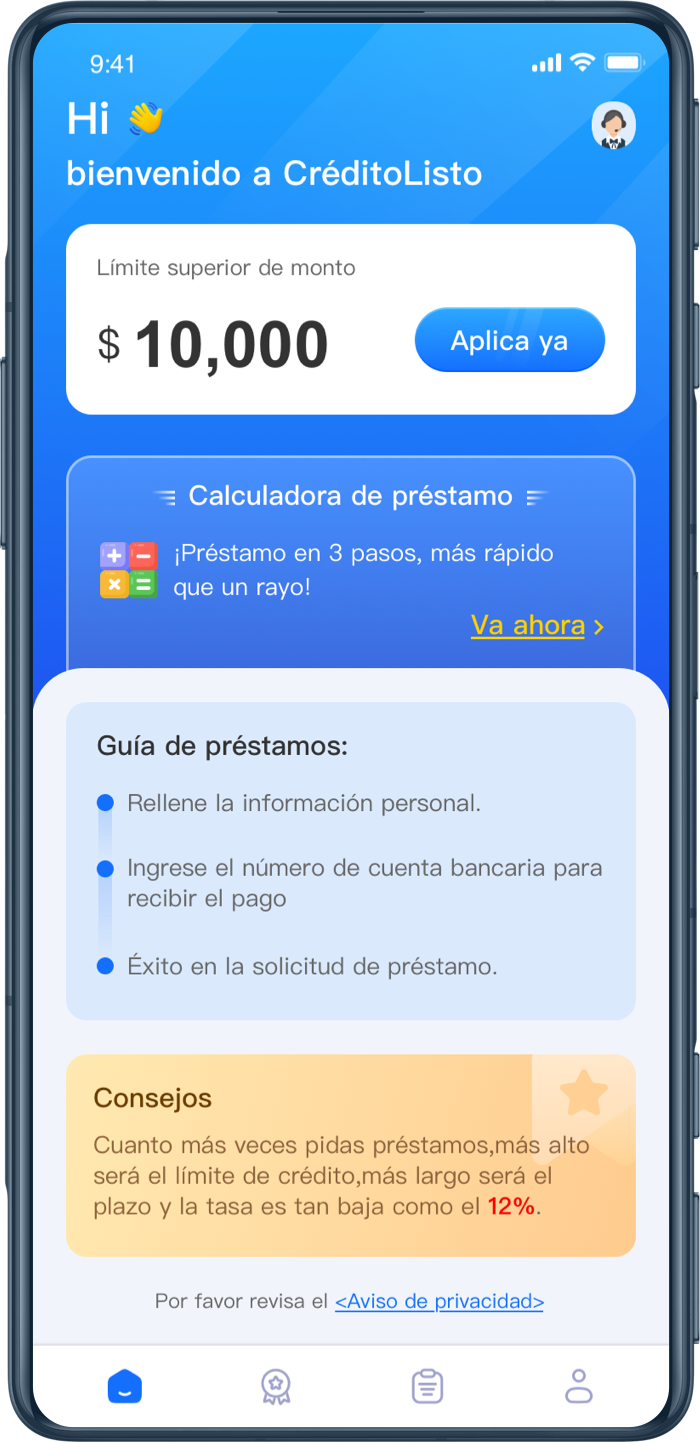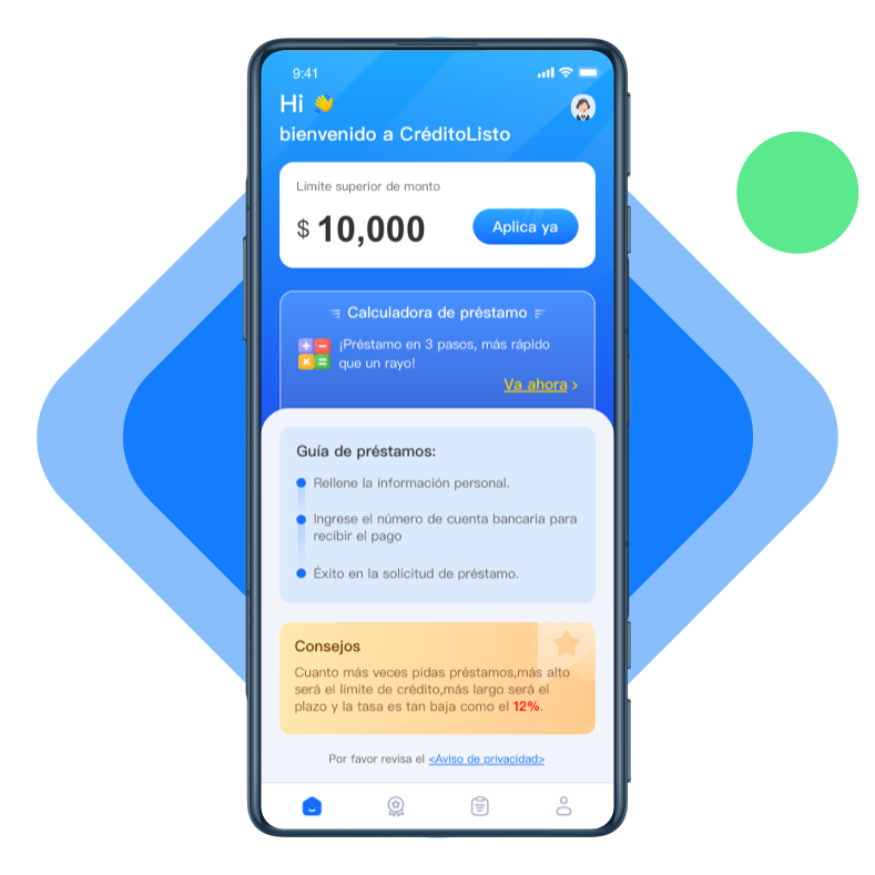 Créditolisto ofrece un servicio de préstamo en línea conveniente que admite múltiples métodos de reembolso, bajos tipos de interés y reembolso flexible. Aprobación inteligente eficiente, llegada máxima de 3 minutos, cifrado estricto para garantizar la seguridad de los datos. Sin costos ocultos, cumplimiento transparente, soporte de servicio al cliente en línea.